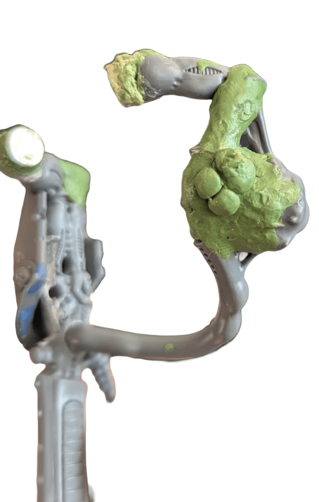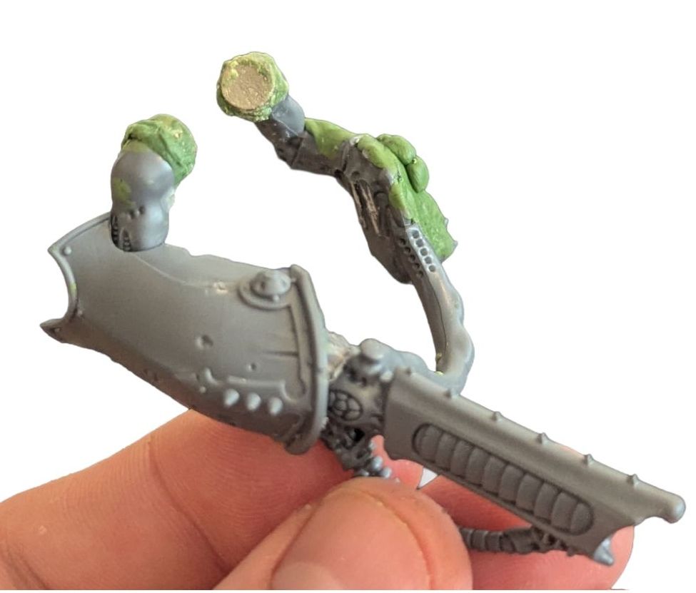 Firstly I looked at leftovers from my defiler kitbash. I had two blight hauler panels left that fit really well around the bicep section if the arm. This ties it into the theme really well I think.